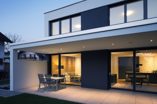 Eine durch eine Sichtschutzwand mit schmalem Oberlicht geschützte Terrasse erweitert den Wohnbereich nach außen und ist vom Küche-Esszimmer Bereich als auch dem Wohnbereich frei zugänglich.